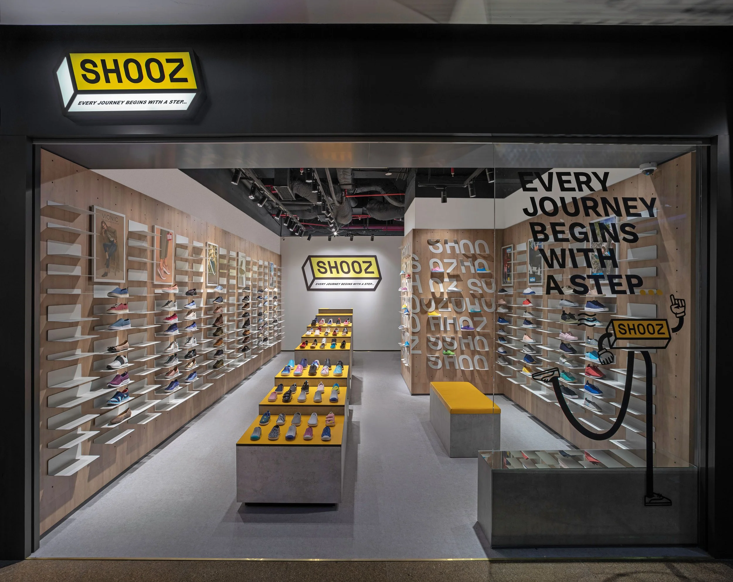The design pulls vision onto the central wall featuring the new brand logo. Along this central axis sit movable display counters, offset for circulation. Terracing towards the cashier, they forego the conventional display systems to make an open plan. Interactions naturally take place around them.